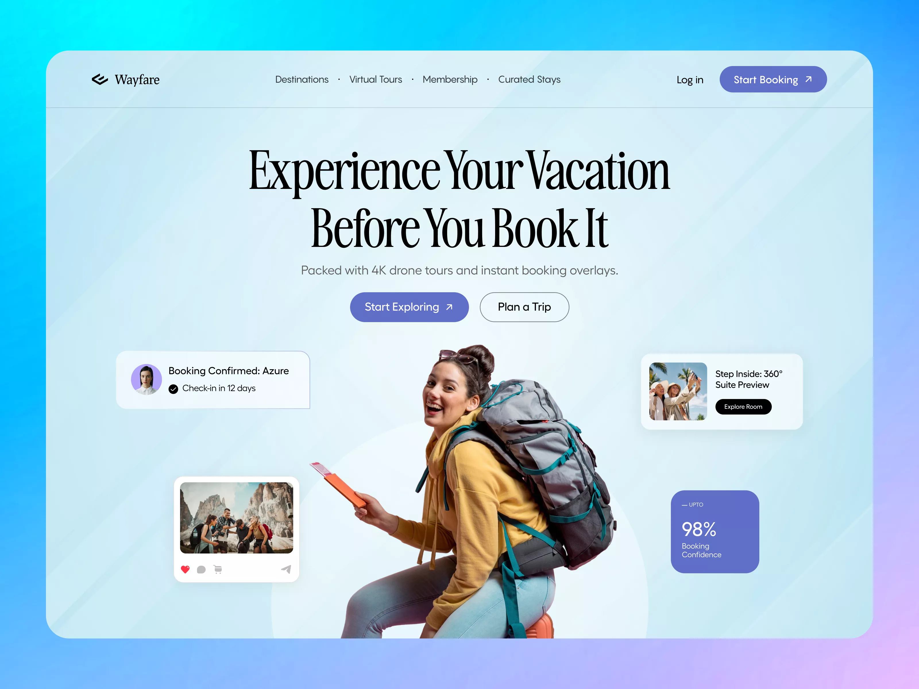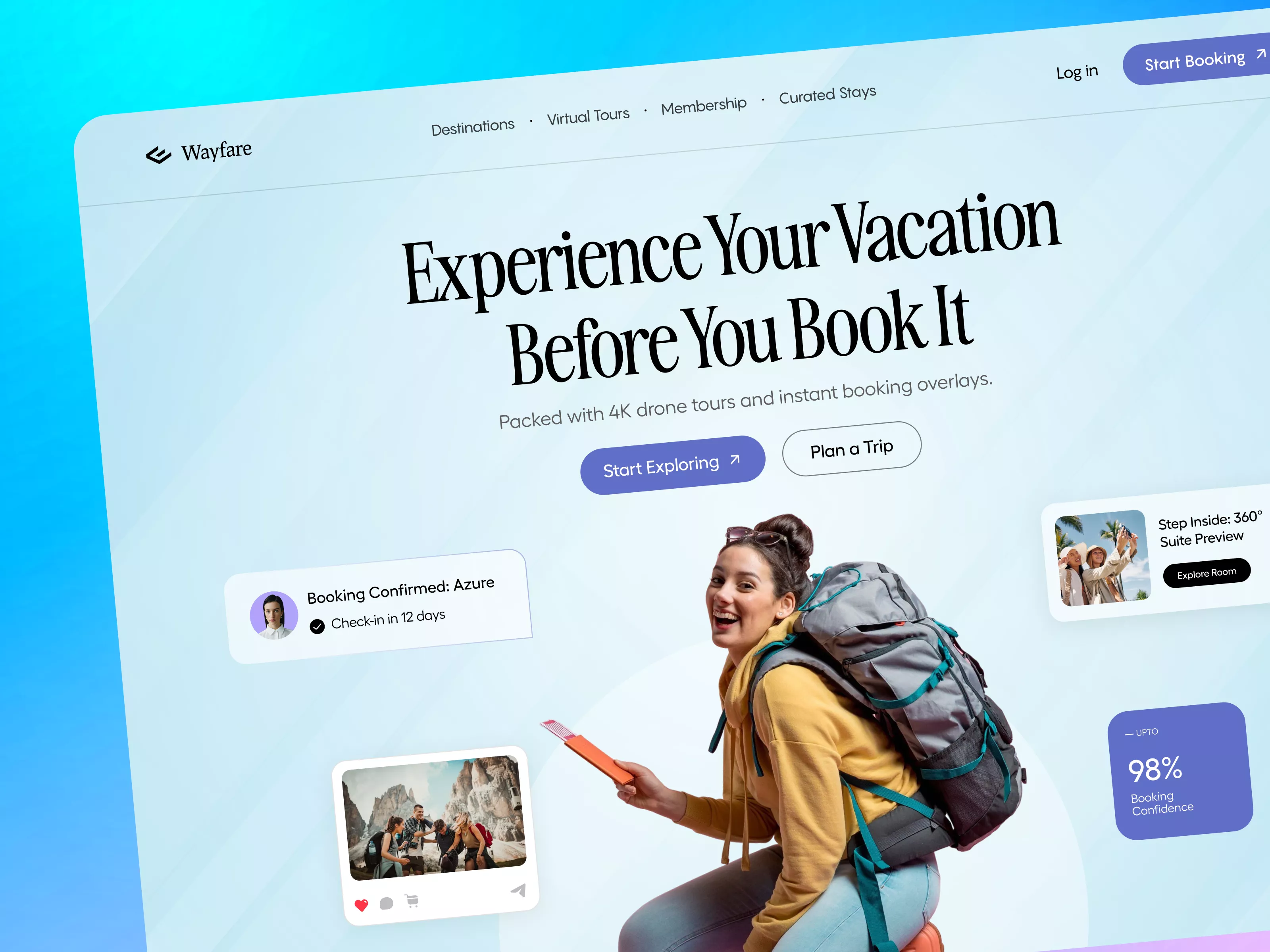 Introducing an immersive and modern UI design tailored for travel enthusiasts and service providers, this dynamic landing page template is an essential addition to your design arsenal. Seamlessly blending aesthetics with functionality, this design invites users to 'Experience Your Vacation Before You Book It,' creating an engaging journey from the first glance. The clean, contemporary layout is enriched with engaging visual elements like a vibrant background, eye-catching typography, and thoughtfully placed interactive buttons such as 'Start Exploring' and 'Plan a Trip'. Designed to captivate and convert, the interface includes strategic sections for curating 4K drone tours and showcasing interactive booking overlays. User testimonials and confidence badges like '98% Booking Confidence' add an air of credibility and ease. The site's sleek menu offers seamless navigation to destinations, virtual tours, membership details, and curated stays, ensuring a user-friendly journey. Built in Figma, this template allows users to effortlessly import and customize the design, accommodating versatile needs with no downloads required. With responsive features, it's perfect for websites aiming to enhance user engagement and drive conversions.