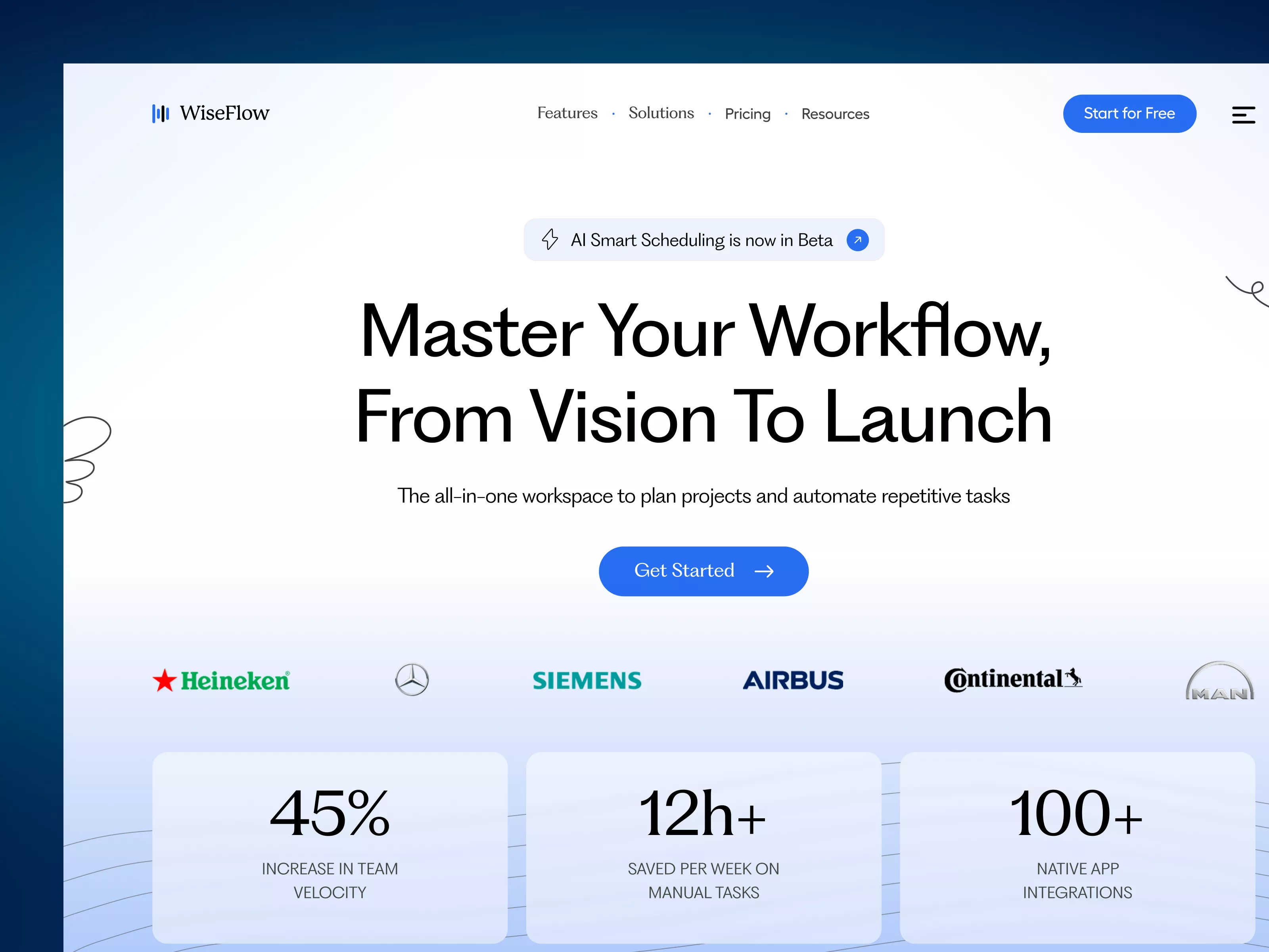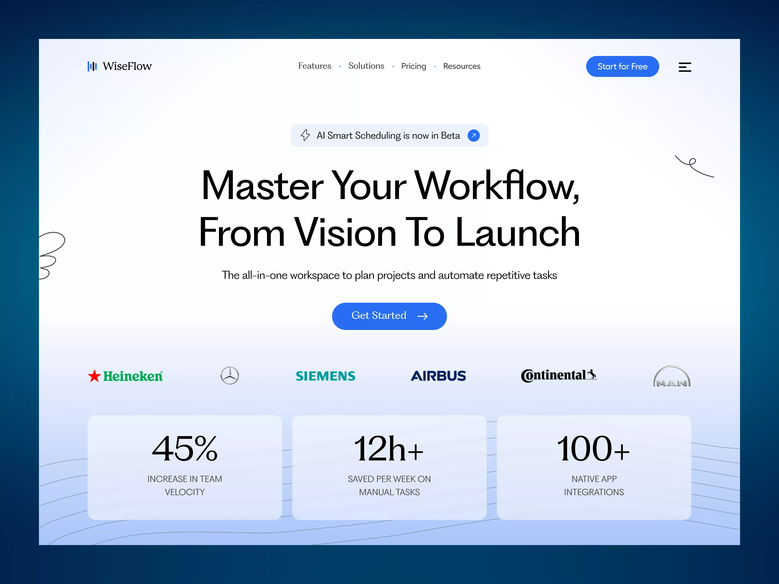 Introducing a meticulously crafted UI design tailored for professionals seeking to elevate their workflow solutions from conception to execution. This design offers a seamless blend of modern aesthetics and functional layout, providing users a streamlined experience whether planning projects or automating repetitive tasks. The header hosts a clean navigation bar, allowing easy access to Features, Solutions, Pricing, and Resources, ensuring users can navigate effortlessly. The central call-to-action, 'Master Your Workflow, From Vision To Launch', is set in bold typography, capturing attention and urging immediate engagement. Below, the supporting text promises an all-in-one workspace, enhancing project management efficiencies. A prominently positioned 'Get Started' button accentuates user involvement. This design is enhanced with reputable brand logos, adding credibility. With an expressive statistic section highlighting significant productivity boosts, this UI persuades users of the tangible benefits of integrating these tools. The design is fully compatible with Figma, allowing direct copy-pasting without cumbersome downloads. It's a perfect choice for digital agencies, tech startups, and consultants looking to impress with both form and function.