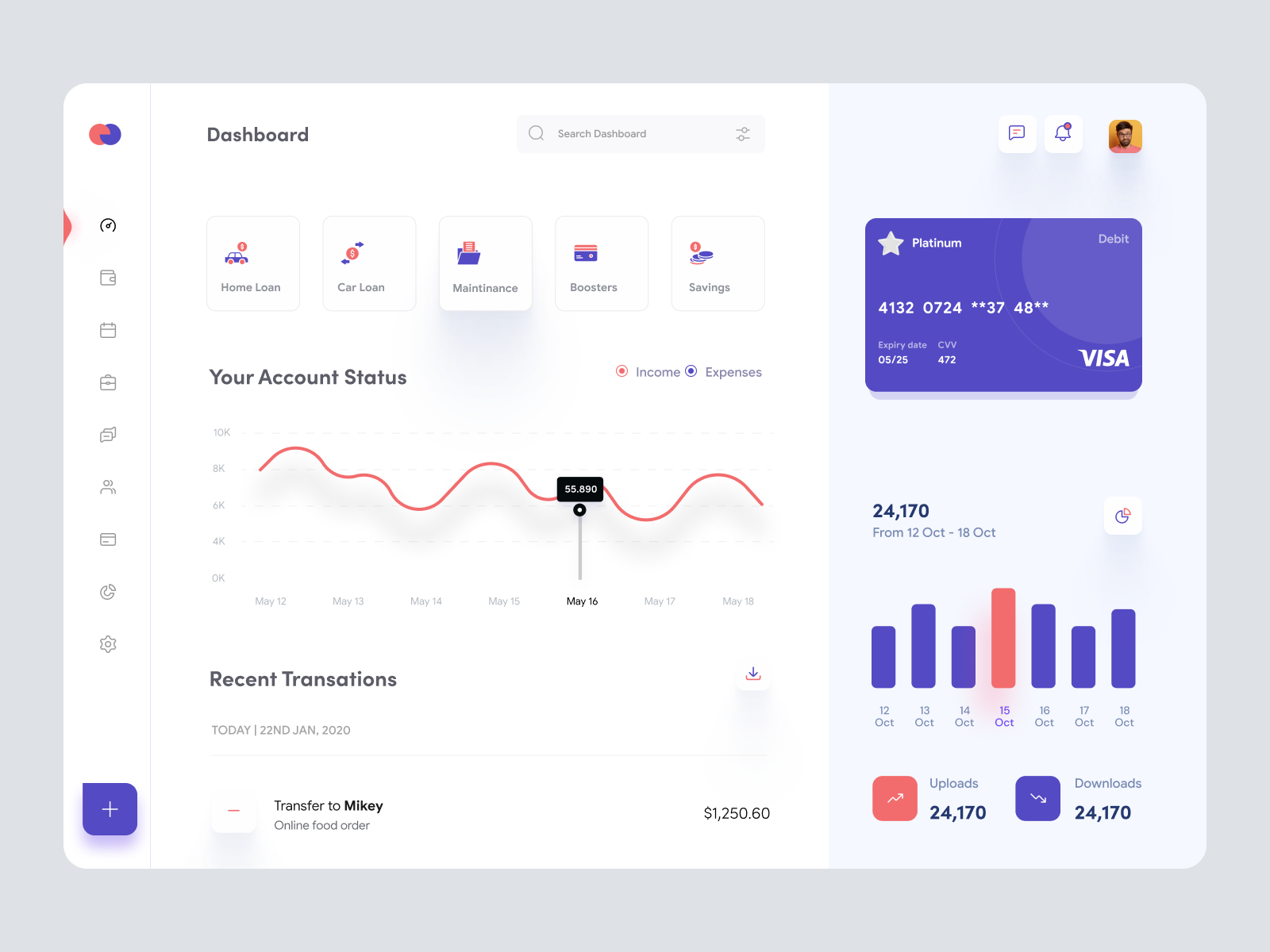 Discover a sleek and modern UI dashboard design tailored to enhance user experience with its intuitive layout and elegant aesthetic. This Figma-ready template offers a clean visual hierarchy that guides users seamlessly through its features, making it ideal for finance and analytics applications. The design incorporates a left-hand navigation bar allowing easy access to various features like home loans, car loans, maintenance, and savings. The account status section provides a clear line graph to track income and expenses over time, optimized for clarity and engagement. A prominent credit card display paired with transaction summaries ensures users can manage and review their financial activities effortlessly. The modern typography, clean lines, and subtle color palette contribute to a sophisticated look, making it a perfect blend of function and style. This UI design promises both aesthetic appeal and practical functionality, ready to be integrated into your digital products with standard drag-and-drop ease.