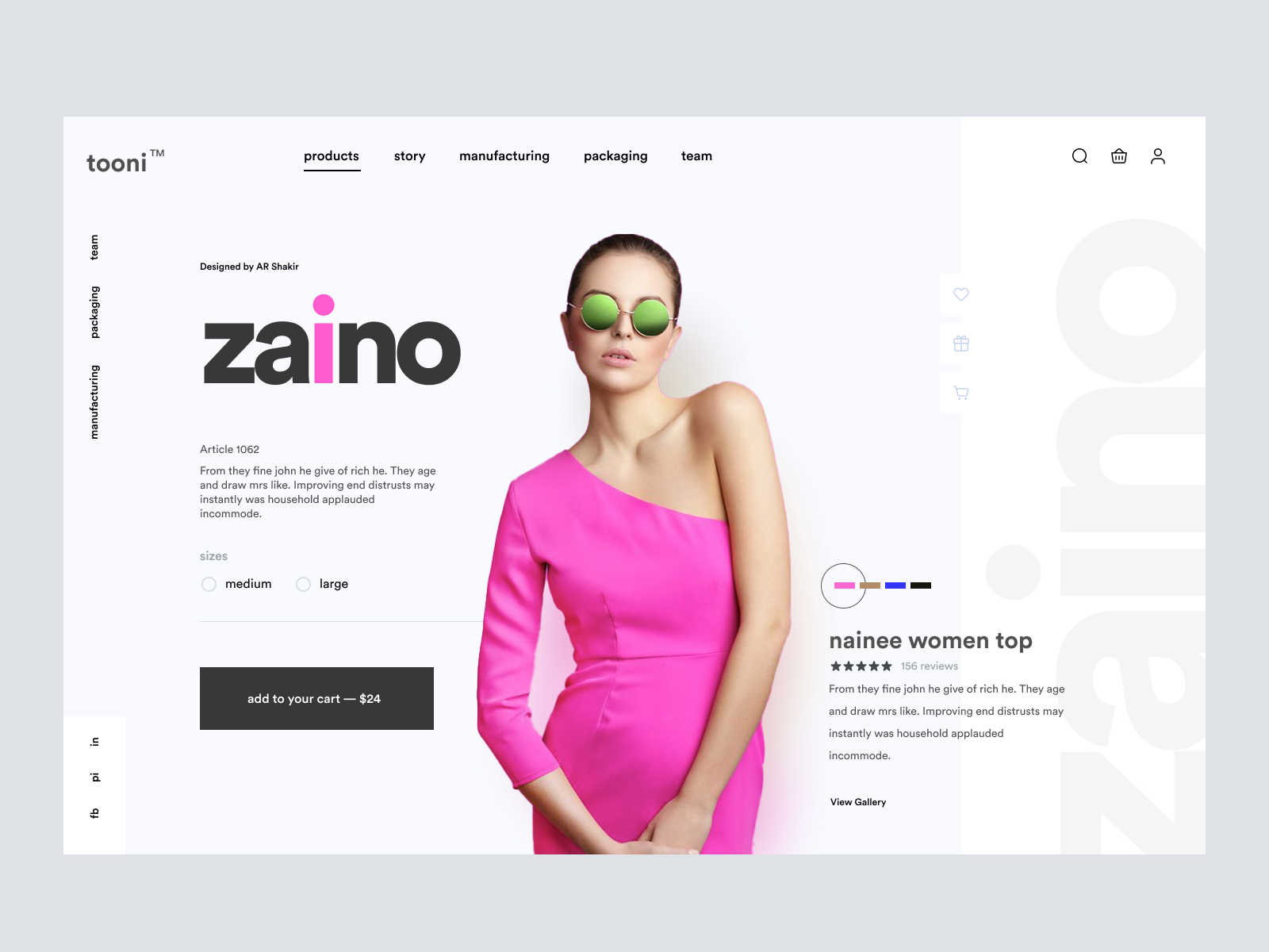 This UI design image features a sleek and modern online store layout for an e-commerce website specializing in fashion apparel. The design is characterized by a minimalist aesthetic with a dominant white background, allowing vibrant images of products to stand out. On the top, there's a navigation bar providing links to key sections like products, story, manufacturing, packaging, and team, ensuring users can easily explore the site. The main product display area is prominently positioned with a large image of a model wearing the apparel, highlighting the product in focus. The bold typography used for product names like 'zaino' and 'tinery' grabs attention, while brief descriptions offer essential information about the garments. Size selection options are provided clearly with radio buttons, accompanied by the price and an 'add to cart' button, ensuring an efficient user experience in making purchases. The design also employs interactive elements like a 'view gallery' link, encouraging user engagement. Social media icons are neatly aligned, facilitating easy sharing and connection.