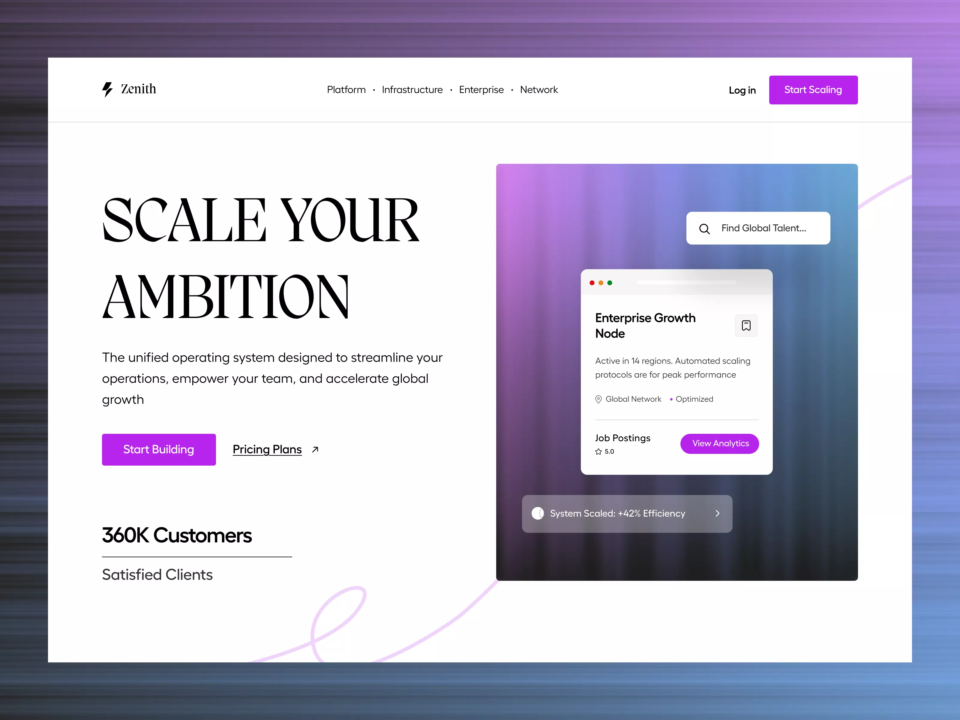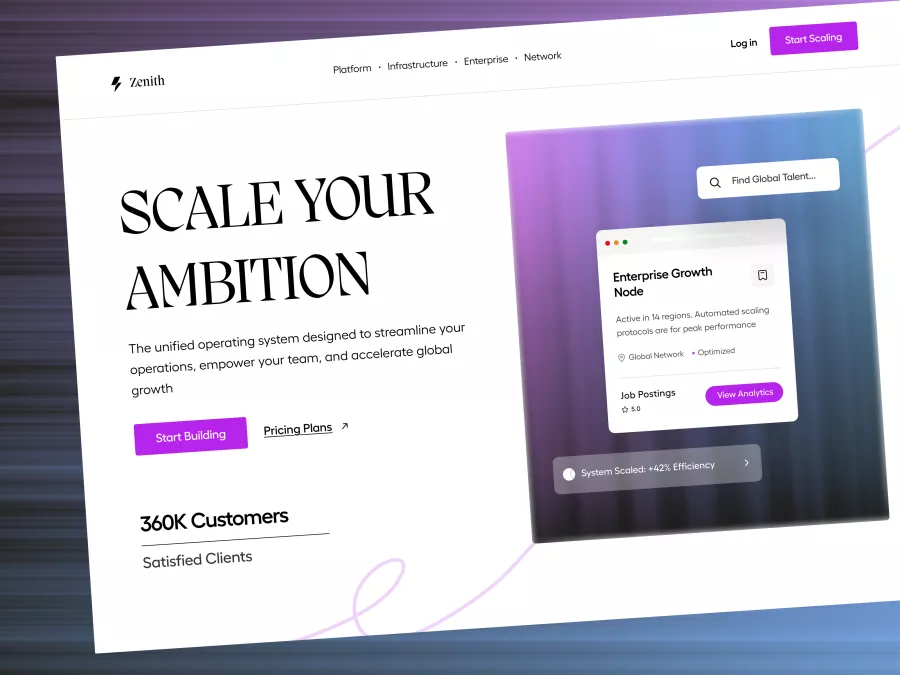 Introducing an exceptional UI design tailored for the ambitious creator and innovator, now available as a Figma file. Crafted meticulously to provide a seamless user experience, this design encapsulates bold aesthetics and user-friendly functionality. Featuring a striking headline 'Scale Your Ambition', it emphasizes growth and empowerment, resonating strongly with visionary clients. The design integrates key interactive elements, such as the 'Start Building' and 'Start Scaling' buttons, encouraging immediate engagement. The vibrant purple call-to-action buttons stand out, drawing users' attention effortlessly. The section highlights '360K Customers', instilling trust and credibility. A sleek module displays 'Enterprise Growth Node' within a sophisticated gradient background, showcasing network efficiency with modern minimalism. This design not only streamlines content presentation but also enhances user journey, ensuring rapid navigation. Delivered in a convenient Figma file, users can copy and paste components directly, expediting their workflow without hassle. Elevate your platform with this design, where practicality meets sophistication, tailored for modern demands.